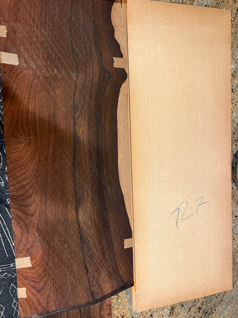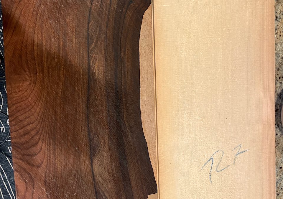 Thanks to a generous donor, SIMSCal members who attended the 2026 annual meeting (and elections) were given the opportunity to blind draw from a couple of boxes of well wrapped guitar sets. I lucked into a gorgeous Cocobolo and German Spruce classical guitar set that is slated to become a modern interpretation of a 30’s Gibson L-00. A small body guitar will also let me take advantage of some of the 125 year old spruce brace material that I salvaged from my father in laws piano. This aged spruce tinkles like ebony when dropped. Thinking that a flame maple binding all around , a similarly bound ebony fingerboard, and a pyramid bridge to complement the 30’s vibe would contrast nicely with the Cocobolo. Vintage amber french polish and some simple pearl position markers. Struggling deciding between 12 or 14 fret necks. I have a nice set of Waverly Slot Head tuning machines the have been sitting for a couple of years waiting on a home, but I do like to play in that octave position and stringing slotted head tuners is more painful than it should be. Decisions, decisions. For now , I guess I should just to don my hazmat gear and get to planing, scraping and sanding,