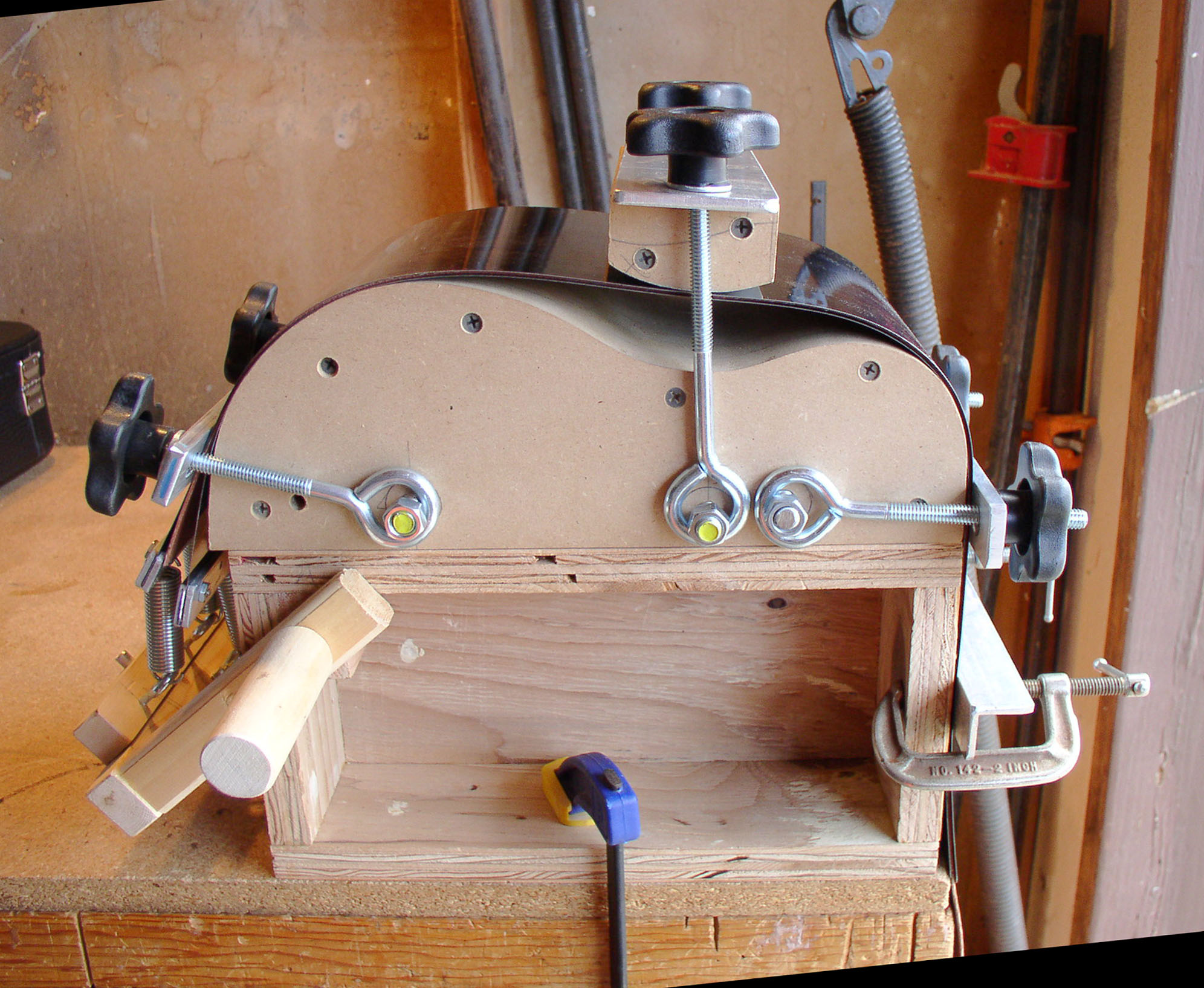 This is the side bender that we came up with at the Huntington Beach Ukulele Company. With a heating blanket and steel slats we attached the side at the edge of the upper bout and pulled the side down to the form as it heated up, clamping at the waist. The lower bout was held to the form as with a Fox side bender.