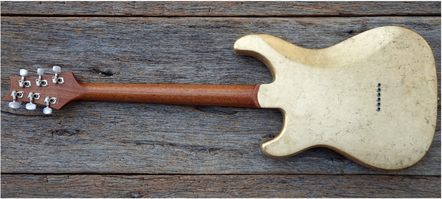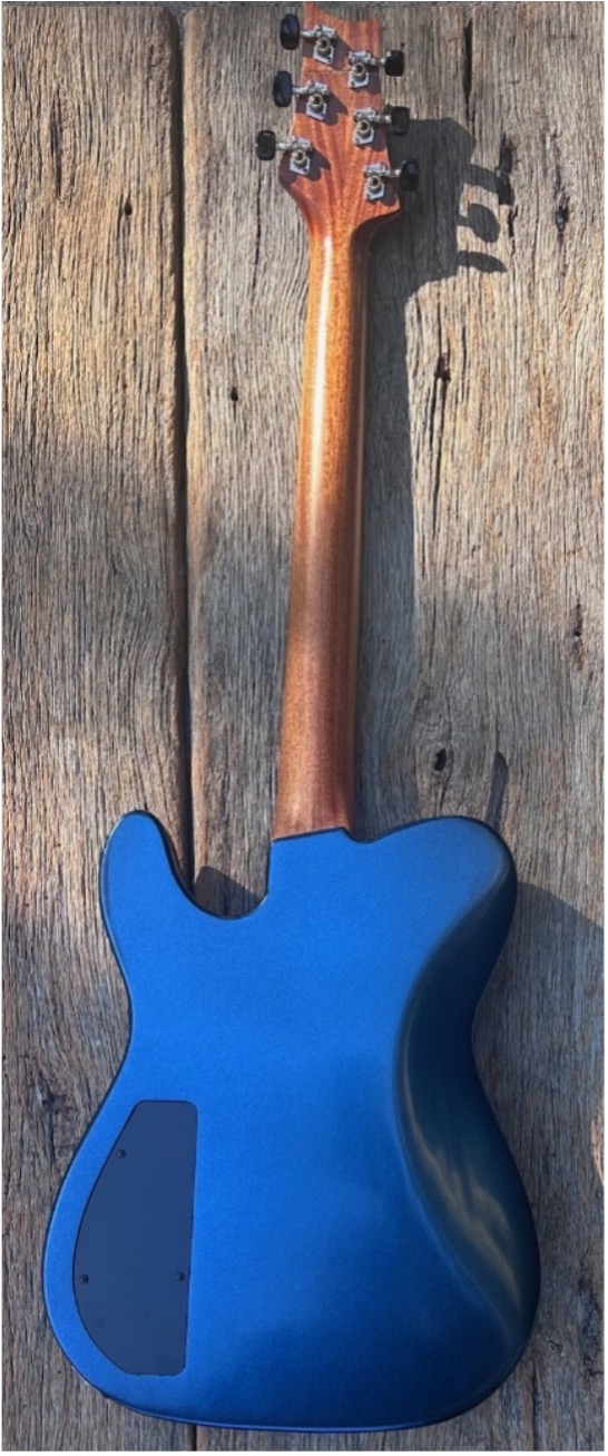 You will learn to construct a solid-body guitar in either a Silver Sky style (front or rear routed) or a modern Telecaster style (front or rear routed). The first example is of a front-routed S-style. This is like a Strat but with a smoother neck heel, a cutaway, and a tilted headstock. The pickguard allows for mounting of any pickup configuration, and the rout underneath is universal. The scale is 25.5” and the bridge is a through-body hard-tail. The neck is glued in. The tuners are small posts on this one, but more typically are larger button Schaller style, with examples below.