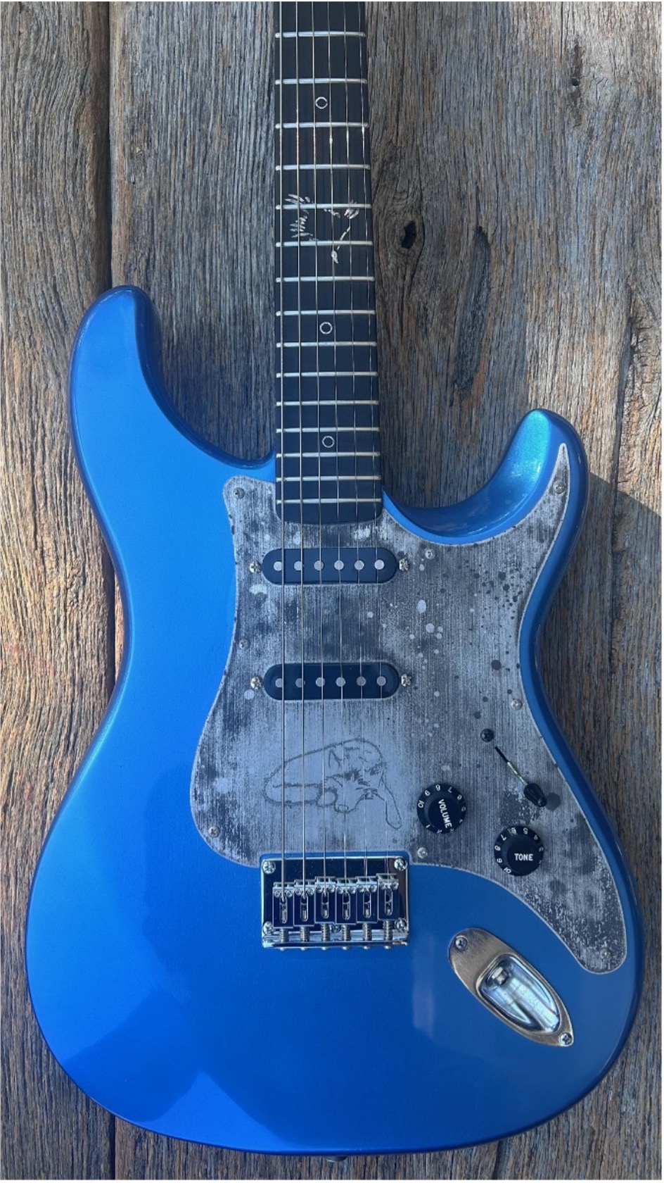 - Pickguard: typical 3-ply from a blank (Warmoth, StewMac), wood, acrylic (to paint from underneath), aluminum or brass (SendCutSend).